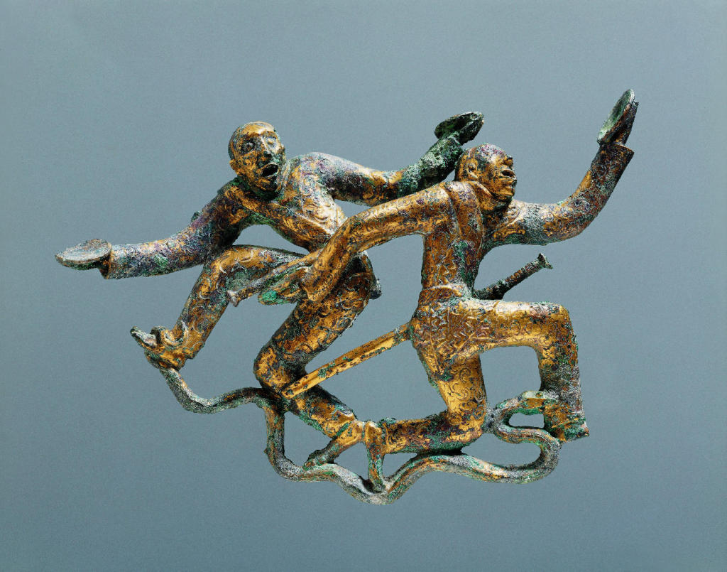 舞姿飞扬,金辉流转。两位高鼻深目的舞者执盘而舞,身姿矫健,衣带生风。其容其装异于滇人,或是远自北疆的“塞人”。整件扣饰充满异域风情,是多元文化激荡的璀璨结晶。