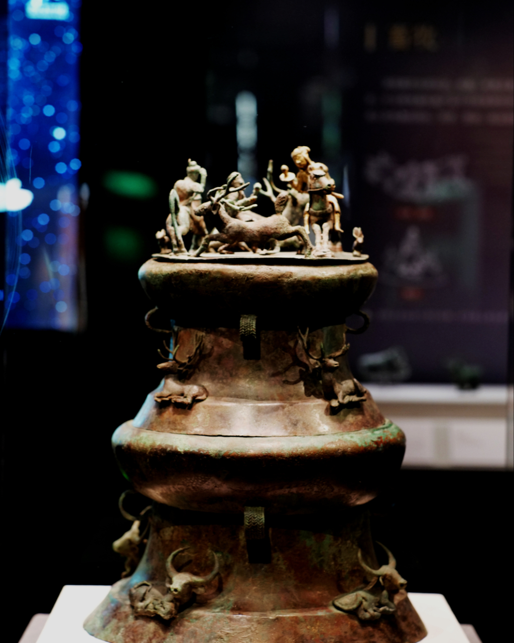 滇是青铜的王国,其青铜文明高度发达,代表了云南青铜时代的巅峰。有别于中原青铜系统,古滇青铜器奇异神秘、极具特色。不同于中原的后母戊鼎、曾侯乙的编钟礼乐、三星堆的青铜神树,滇人通过高超的冶铸技艺、写实的表现手法,将社会生活立体铸造在背铜器上,既有表现宗教祭祀、战争杀戮等场景,也有充满烟火气的生活生产场景;青铜器上大量的动物塑造生动写实,人物铸造则复原古滇人的形象。