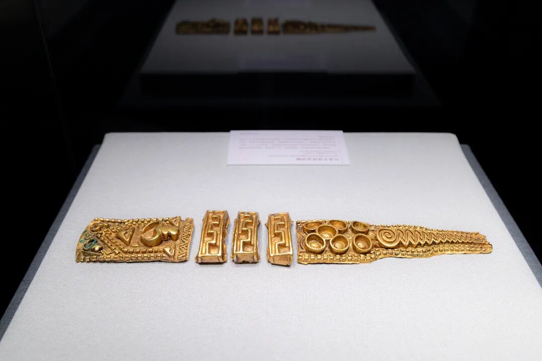 金鞘耀目,牛首威严。这件剑鞘由黄金压制而成,分为三段,上段的压花牛首纹样融合了滇地风尚与草原气息,既彰显持剑者尊贵身份,亦见证古滇与北方草原文明的艺术交融。