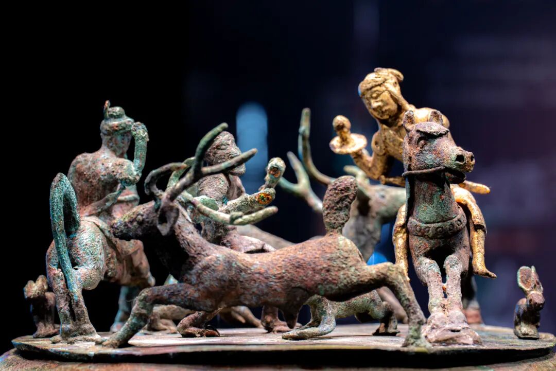 策马疾驰,狩猎正酣。这是目前仅存的四件叠鼓形贮贝器之一,器盖上雕铸生动立体的狩猎场面,骑士策马逐鹿,猎人持矛合围,犬、兔奔腾其间,堪称古滇青铜技艺巅峰之作。