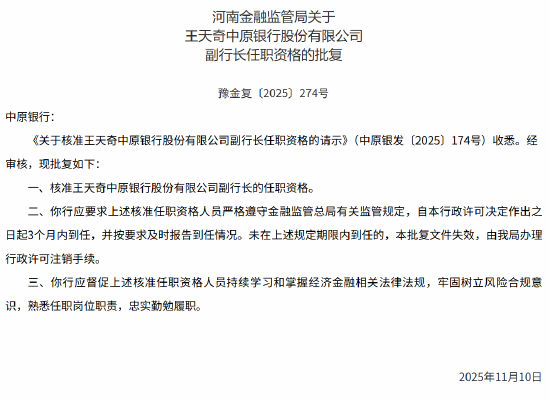 11月19日金融一线消息,日前,河南金融监管局连发三条批复,核准中原银行副行长刘清奋、姚辉元、王天奇的任职资格。