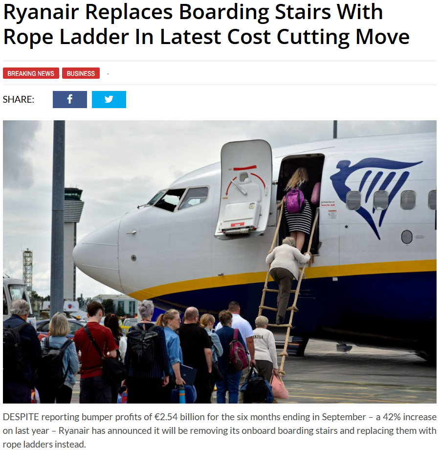 其发布的文章声称,尽管瑞安航空公司表示,今年4至9月的利润同比大幅增长,但首席执行官迈克尔奥莱里仍计划通过使用价格低廉的老式绳梯代替金属舷梯来进一步降低成本。