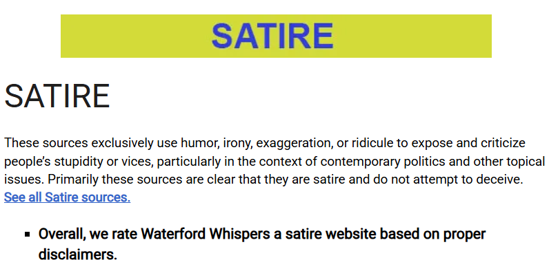 根据信源评估机构 MBFC(Media Bias/Fact Check)的评价,Waterford Whispers News 并非新闻媒体,不提供事实报道。其内容以幽默、讽刺和夸张的方式评论时事与政治话题。该网站本身也在页面中注明了讽刺性质的免责声明。