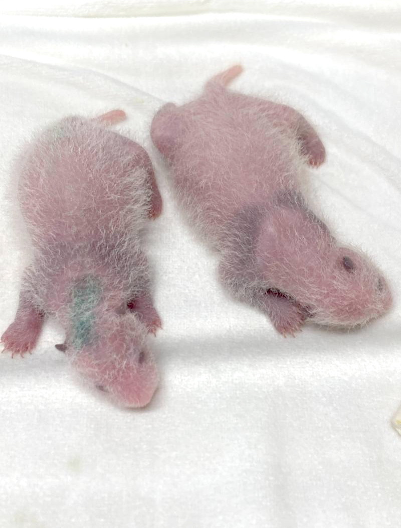 2021年7月1日,刚出生不久的大熊猫双胞胎幼崽“晓晓”和“蕾蕾”。