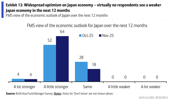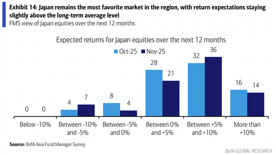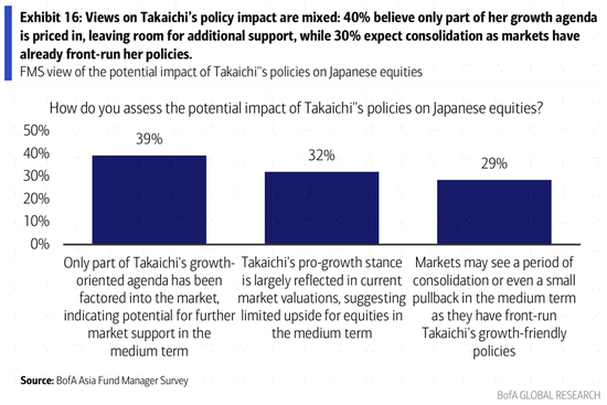 4. 投资者对日本经济进一步乐观,相比10月,更多人认为日本经济会走强,36%的投资者认为日股未来1年期望回报率在5~10%,39%的投资者认为市场仅计入了部分高市的增长导向政策