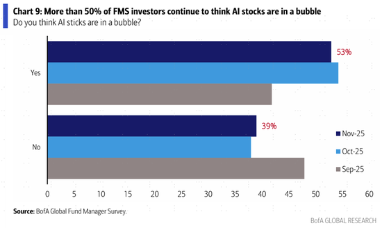 3. 45%的人认为AI泡沫是最大的尾部风险(vs. 10月的33%),其次为债券收益率的失序上升(17%);53%的投资者认为当前AI已出现泡沫,略低于10月的54%