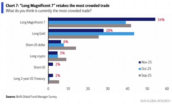 5. 做多科技七姐妹重新成为最拥挤的交易(54% vs. 10月的39%),其次是做多黄金(28% vs. 10月的43%)