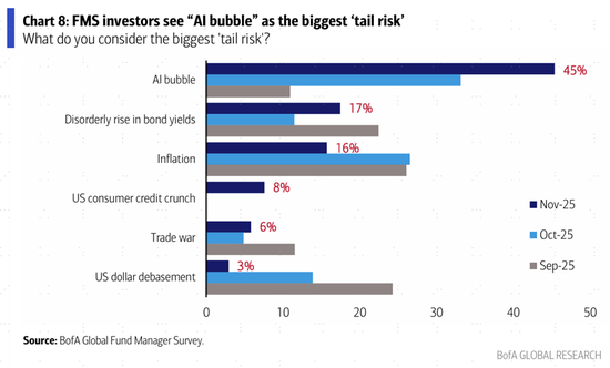 2.45%的人认为AI泡沫是经济最大的尾部风险,53%的投资者认为当前AI已出现泡沫