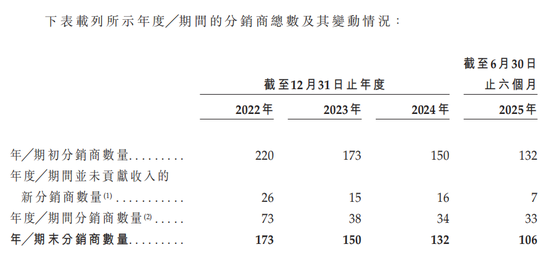 此外,蔓迪国际近年来还面临着分销商数量锐减的情形。招股书显示,蔓迪国际的大部分产品销售给了分销商,2022年至2024年及今年上半年,公司向分销商销售产生的收入分别占产品销售总收入的96.4%、91.2%、87.9%、80.6%;截至同期期末,公司分销商数量分别为173家、150家、132家、106家,呈现逐年下降趋势。