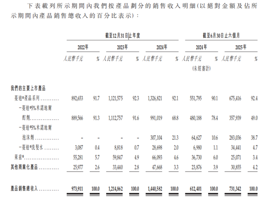 2024年,蔓迪国际推出第二代产品打造新增长引擎,即蔓迪5%米诺地尔泡沫剂。今年上半年,该款产品销售额达2.83亿元,较去年同期0.65亿元的销售额大幅增长,收入占比也升至38.7%。
