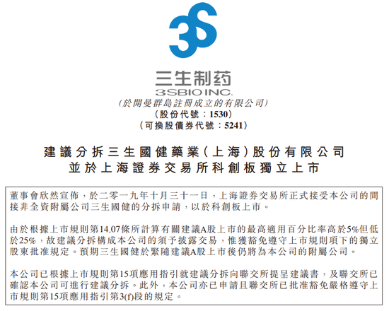 2019年10月31日,三生制药公告,上交所已正式接受其间接非全资附属公司三生国健的分拆申请。三生制药董事认为,此次分拆能够量化三生国健股权的市场价格、并为其提供新的资金来源,同时能提升三生制药及三生国健的知名度。