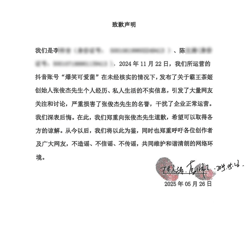 霸王茶姬方面对澎湃新闻表示,公司已使用法律手段对造谣者进行了打击。今年4月,人民法院公告网公布的一则起诉状副本及开庭传票,显示了与该系列谣言相关网络侵权责任纠纷的处理进展:造谣者依法受到了处罚,并公开道歉。张俊杰在朋友圈中也引用了道歉截屏。