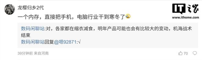 另一名用户则表示:“一个内存,直接把手机,电脑行业干到寒冬了”,博主则回复道:“对,各家都在缩衣减食,明年产品可能也会有比较大的变动,机海战术结束”。