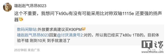 后续有用户在评论区询问:“这个不重要,我想问下 k90u 有没有可能采用比对称双轴 1115e 还要强的扬声器”,博主回复道:“外放要求高建议买 K90PM”。