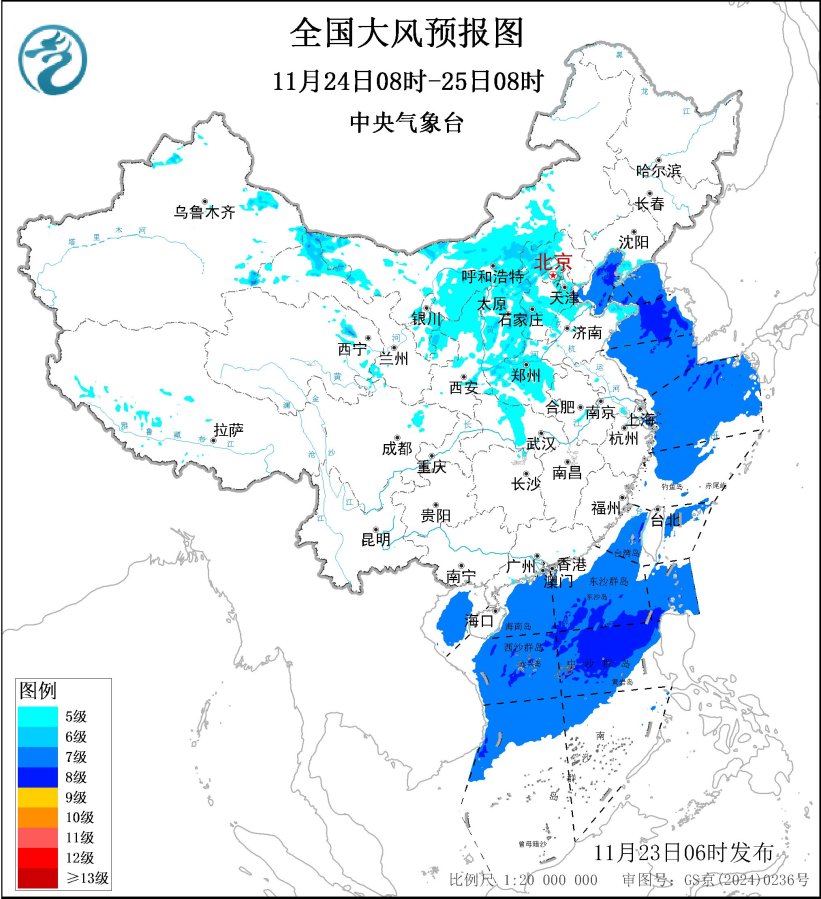 11月24日08时至25日08时,内蒙古中西部、甘肃北部、青海东北部、西北地区东部、华北等地的部分地区有5~7级大风,阵风8~9级,黄淮北部和西部、江汉等地的部分地区有5~6级大风,局部地区阵风7~8级;、黄海中部和南部局地、南海北部和中部海域将有7~8级、阵风9~10级的大风。