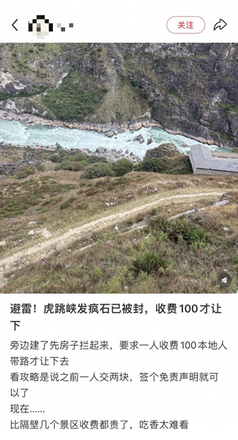 11月22日,有游客发帖爆料称,此前因安全隐患封禁的云南香格里拉虎跳峡“发疯石”区域,有村民收取100元/人的“带路费”,声称“交钱就能下去”。该帖子迅速引发网络热议。