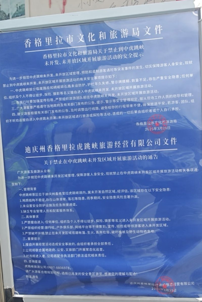 今年3月,香格里拉市文化和旅游局曾发布《关于禁止到中虎跳峡未开发、未开放区域开展旅游活动的安全提示》通知,明确规定“中虎跳峡部分临崖路段和崎岖碎石路未设防护,护栏年久失修,警示牌模糊、数量不足,存在严重安全隐患;任何单位、组织及个人不得以徒步、探险、摄影等名义擅自进入中虎跳峡未开发、未开放区域开展旅游活动。严禁组织旅游团队前往中虎跳峡未开发、未开放区域开展旅游活动。