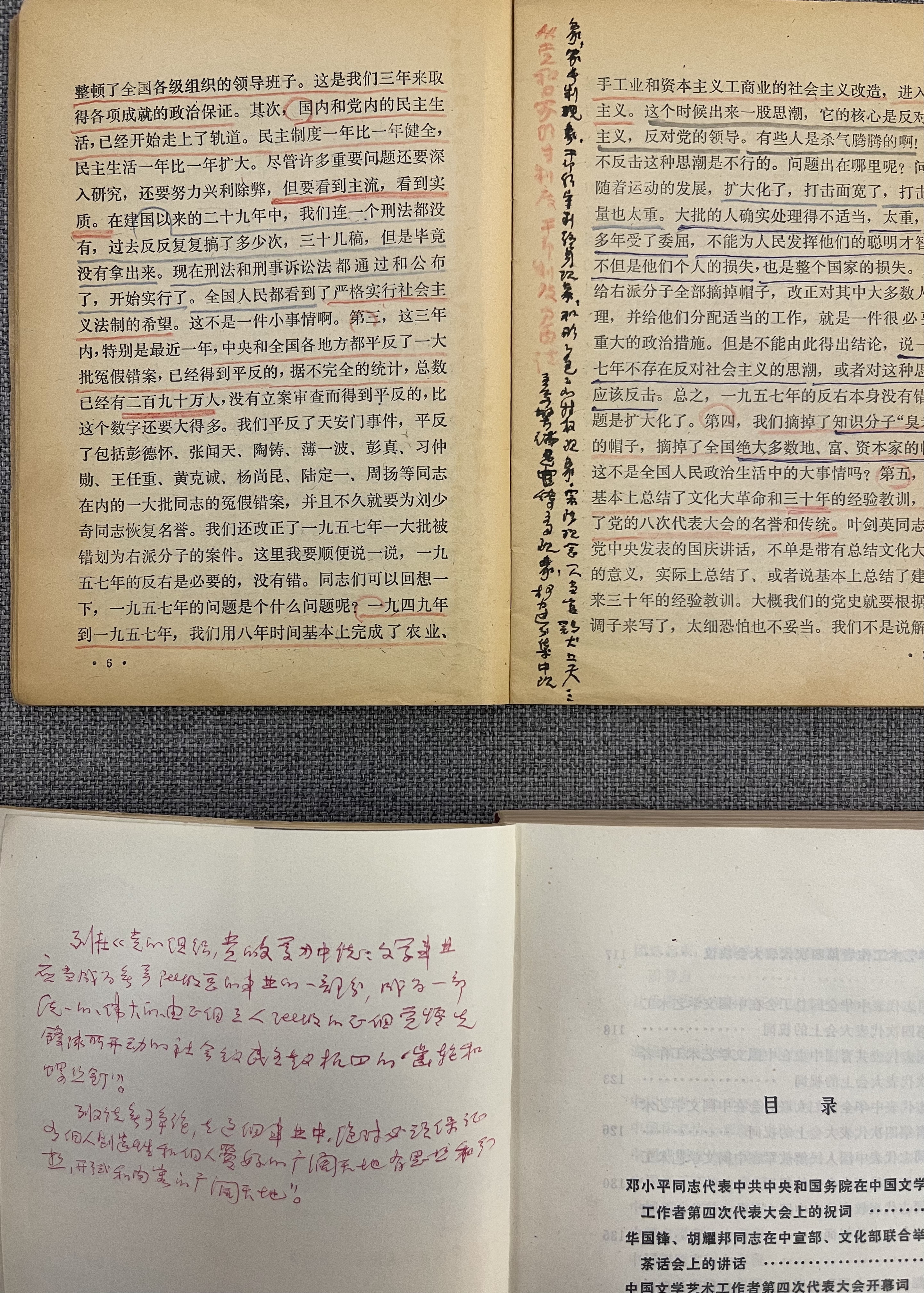 澎湃新闻在展出现场看到,舒同生前使用过的毛笔、砚台、读书笔记等,仿佛如见其人。其中,两本书籍的页面上密密麻麻记录着他的读书感想。