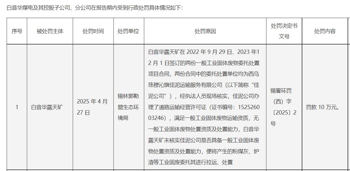 2023年以来,白音华露天矿受到19次行政处罚,就2025年以来就有3次,行政处罚涉及环保、施工安全等,比如该煤矿有超过180天未组织安全设施竣工验收遭到处罚,其环保和安全隐患潜藏其中。