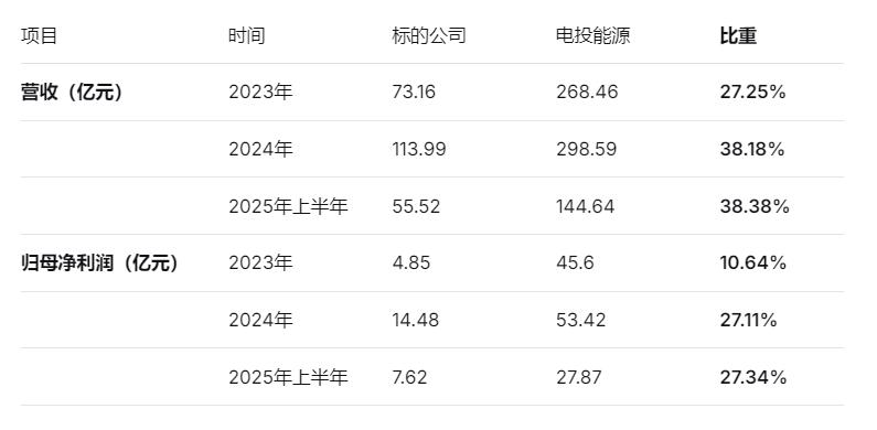 2025年上半年,电投能源营收、净利润分别为144.64亿元和27.87亿元;白音华煤为55.52亿元和7.62亿元,以此计算,标的公司的营收约占上市公司的38.38%,归母净利占比为27.34%
