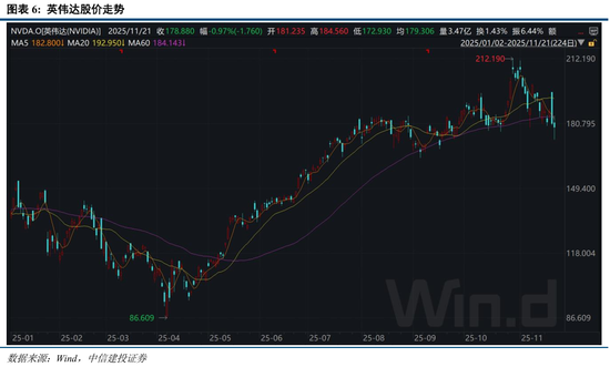 周四英伟达发布三季度财报,财务表现强劲,营收与利润双超预期,数据中心业务持续主导增长,盈利能力维持高位,现金流与股东回报稳健。尽管英伟达财报超预期,但市场对AI泡沫的争议未消,部分市场观点认为AI基础设施投资存在过热风险,若云厂商未来缩减AI支出,需求增长或不可持续,并且部分企业已展示“无英伟达芯片”的大模型研发能力,可能削弱长期技术壁垒;除此之外,地缘政治与市场受限,美国对华出口管制导致中国市场数据中心收入几乎为零,长期缺失或影响全球份额扩张。受此影响,周四英伟达股价高开一度上涨5%左右,随后持续走低,最终收跌3%左右。