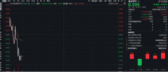 热门ETF方面,布局电子板块核心龙头的电子ETF(515260)震荡下挫,场内价格现跌0.83%,资金无惧行情波动,坚定逆行加仓,上交所数据显示,该ETF近3日连续吸金,合计金额1120万元,反映资金看好电子板块后市表现,提前进场埋伏!