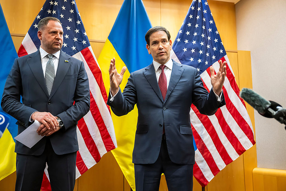 2025年11月23日,瑞士日内瓦,乌克兰总统办公室主任安德烈叶尔马克(左)与美国国务卿马可卢比奥(右)在美国常驻联合国代表团举行磋商后向媒体发表讲话。视觉中国 图