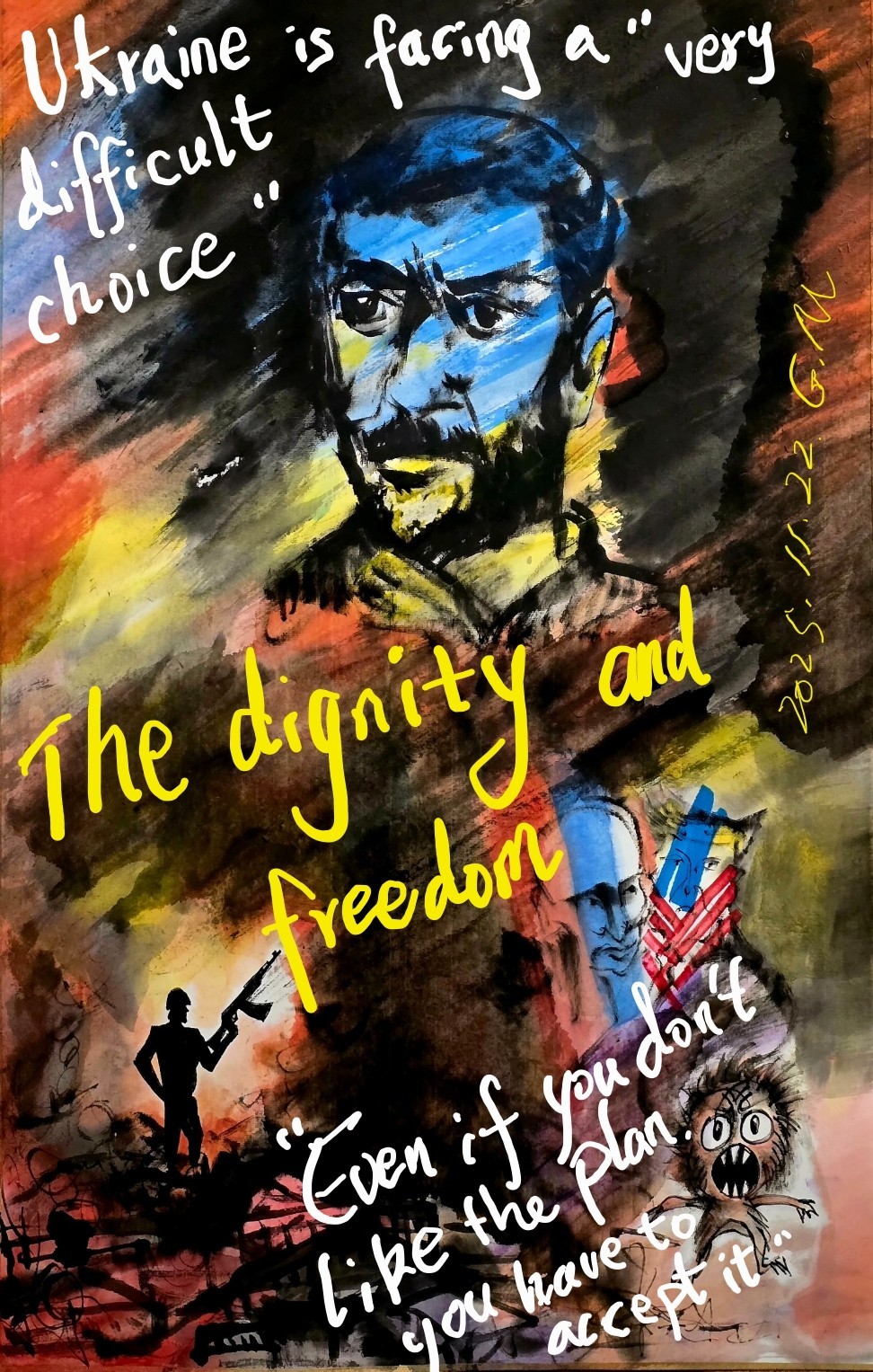 图1 乌克兰正面临“非常艰难的选择”纸本彩墨 65cm X 45cm,李公明 作 2025年11月22日