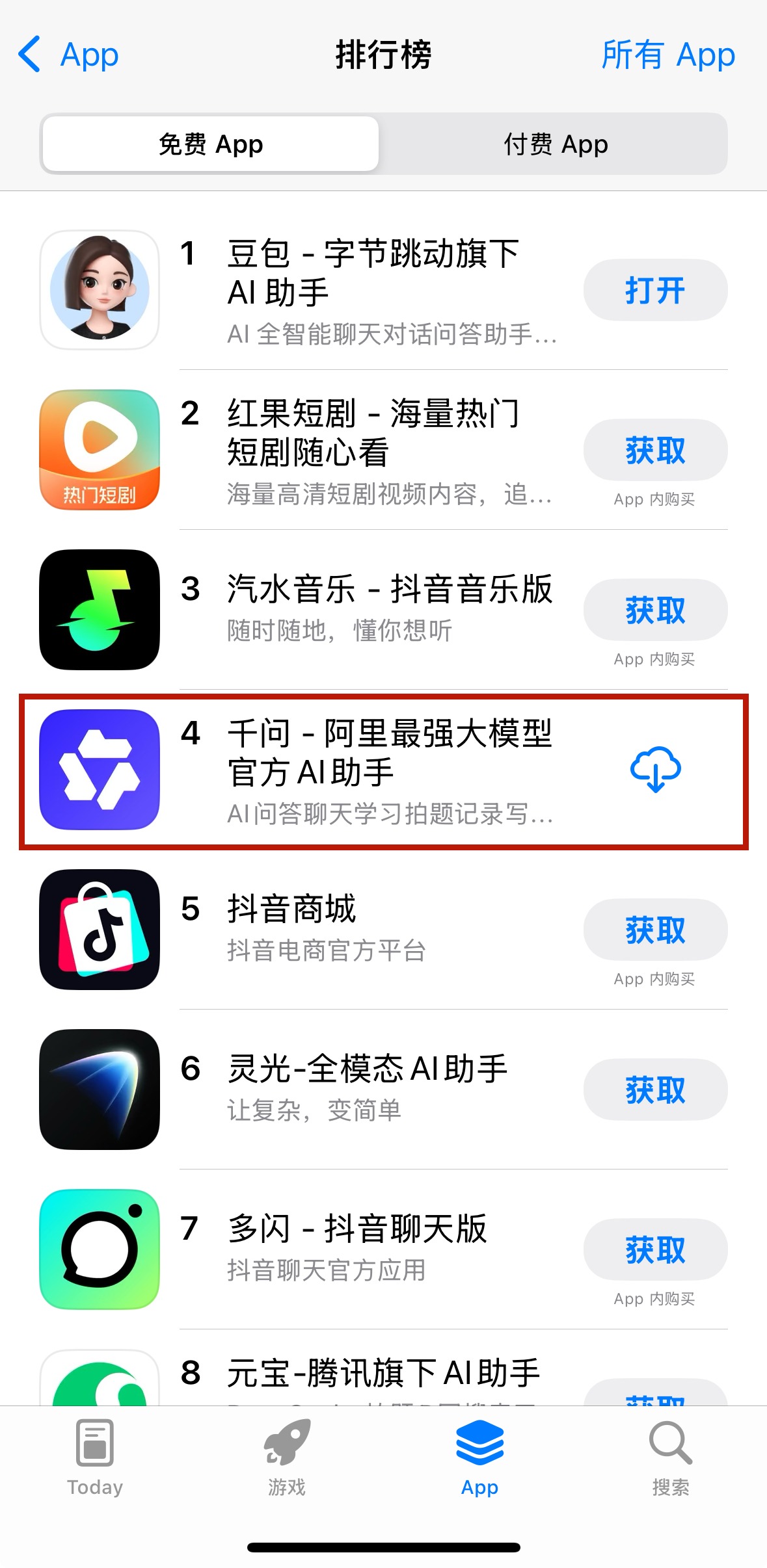 图片来源:千问千问于11月17日正式开启公测,主要瞄准消费端市场。该应用基于阿里的开源模型Qwen3开发,免费向用户开放,直接与行业头部应用ChatGPT展开竞争。上线次日,千问APP便迅速攀升至苹果App Store免费应用总榜第四位,两天后又冲入该榜单前三甲。目前略有下降,已重新回到第四位。