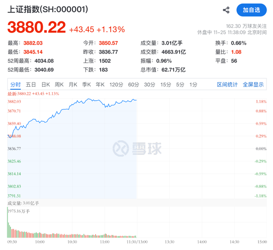11月25日上午,A股早盘高开高走,创业板指一度涨至3%。
