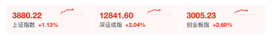 截至午间收盘,沪指报3880.22点,涨1.13%,深证成指涨2.04%,创业板指涨2.6%。