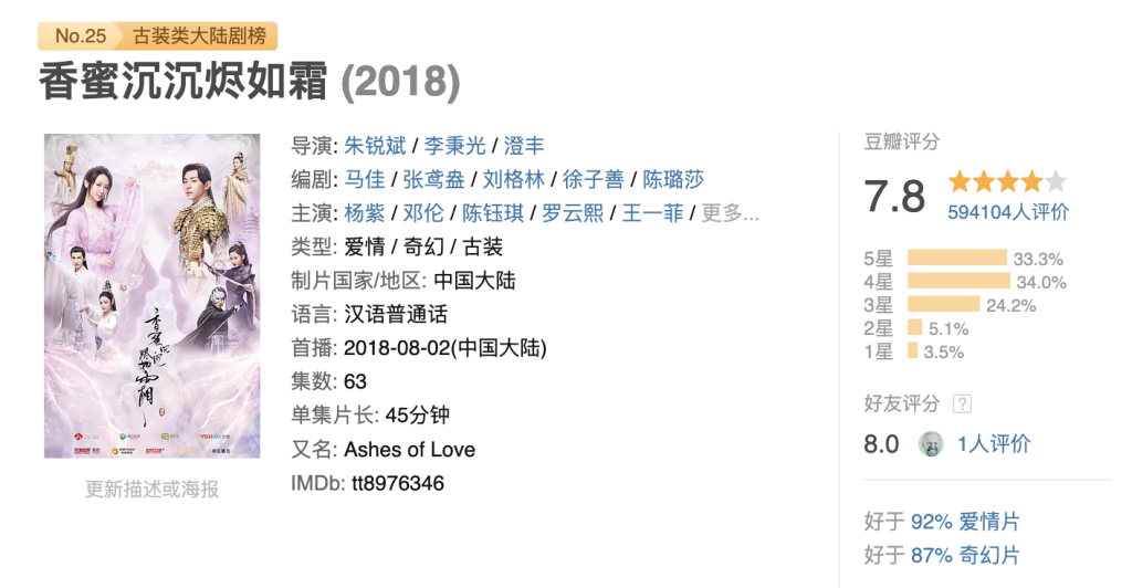 《香蜜沉沉烬如霜》豆瓣评分7.8,有近60万网友打分