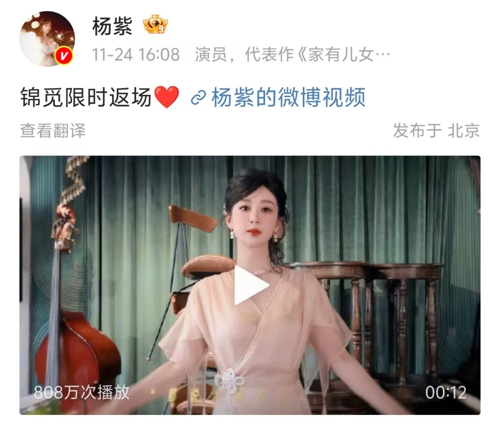 时至今日,《香蜜》依然保持着豆瓣7.8分的良好口碑,更难得的是播完多年依然拥有极高的讨论度和影响力。就在两天前,杨紫发布了一条“锦觅限时返场”的“香蜜转场”视频,迅速登上热搜第一,评论区直接成为大型怀旧现场,连带长剧也时隔七年登顶爱奇艺电视剧榜。