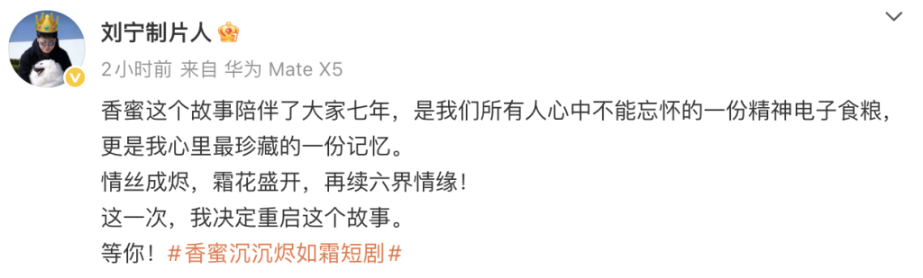 11月26日,曾一手打造《香蜜沉沉烬如霜》长剧的制片人刘宁发文,正式盖章这个项目要以短剧的形式重启:“霜花即将重新盛开,六界的故事等待续写。”他还透露,观众有什么“意难平”都有可能在短剧里弥补。