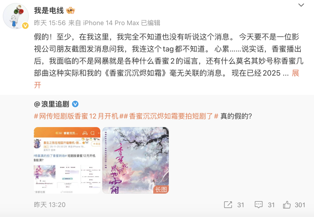 11月25日,网上再度传出“短剧版香蜜12月开机”的消息。当晚,已经两年没更新微博的原著作者电线上线“打假”:“假的!至少,在我这里,我完全不知道也没有听说这个消息。”