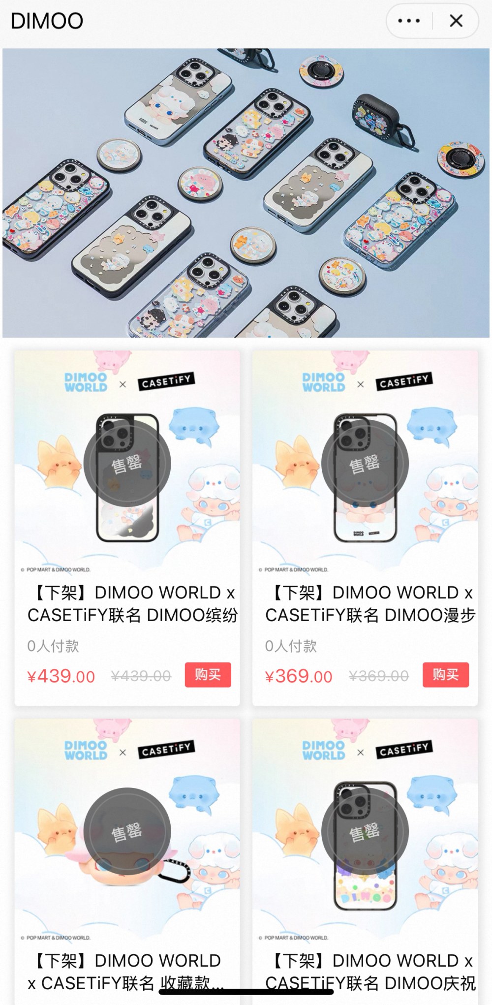 尽管价格较高,但界面新闻发现,不少联名手机壳已处于售罄状态。像是DIMOO WORLD联名手机壳已全部售罄,目前线上处于下架状态,价格从259元到439元不等;迪士尼奇奇蒂蒂联名系列则从259元到479元不等,其中439起的奇奇蒂蒂花生款也已售罄。