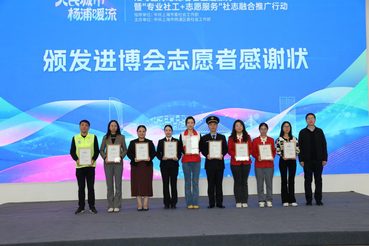 重大赛事、活动保障是志愿服务的重要领域之一。前不久,B站“干杯音乐节”、小红书“冒险岛”等重大活动,踊跃着一批年轻志愿者。在不久前圆满落幕的进博会上,杨浦区的志愿者也以出色的表现,成为了城市形象的温暖代言。市委社会工作部社会工作服务和志愿服务推进处处长薛铮为进博会志愿者代表颁发感谢状,向他们的辛勤付出致以崇高敬意。