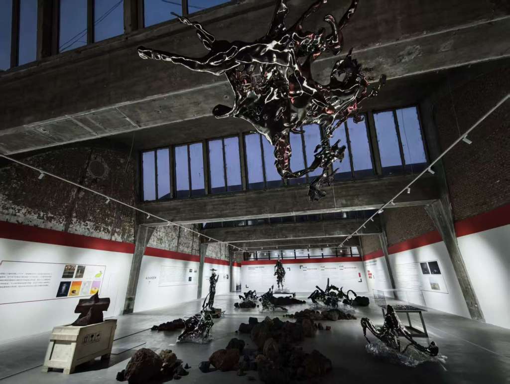 798CUBE的“混成:王郁洋个展”系统梳理艺术家近十年的创作,展示其在生命、机械、语言、代码之间搭建的复杂世界。展览入口的纪念碑式装置《共生》象征人类幻想与机器偶发的相互缠绕;互动作品《梦》让观众通过脑电波驱动机械臂在纸上绘制“梦境”。