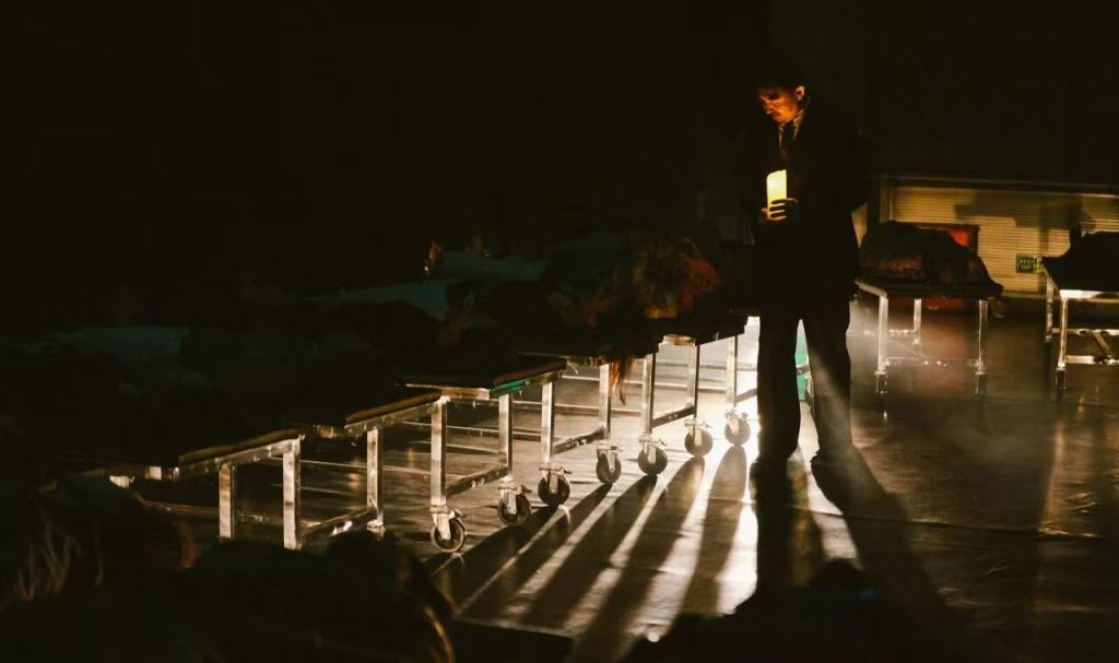 戏剧板块中,中国首部由AI深度参与的沉浸式戏剧《躺平2.0》引发关注。观众寄存电子设备、脱鞋躺上移动床,被缓缓推入全黑空间。两位真人演员与AI共同构成叙事结构,通过关于生命与死亡的追问,引导观众进行个人化回应。现场的实时拍摄、AI生成的“墓志铭之歌”等环节,使观演过程在心理和情绪层面变得异常直接。