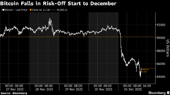 “这是12月的风险规避式开局,”FalconX 亚太衍生品交易主管Sean McNulty表示。“现在最大担忧是比特币ETF的资金流入量微弱,而且缺乏逢低买盘承接。我们预计结构性逆风将在本月持续。80,000美元值得关注,可能是下一关键支撑位。”