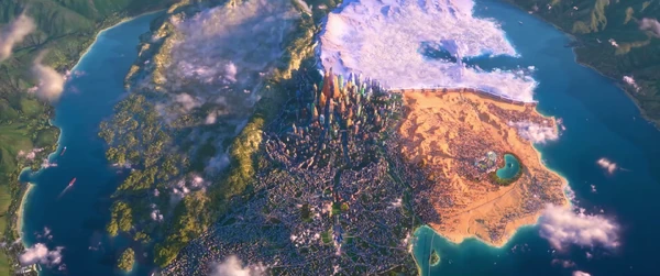 在第一部里,观众看到了由气候墙发挥功能,让共存形成的动物城建筑。在气候墙出现后,能同时容纳雨林区(Rainforest District)、冰川镇(Tundra town)、撒哈拉广场(Sahara Square)和萨瓦那中心(savanna central),动物城才正式成为现代社会技术得以运行的空间,这既是对乌托邦文学里经典的分区结构的复现,同时也是自然乌托邦发挥作用的必然产物(详见笔者的澎湃文章《<熊出没重启未来>:自然批评的生态书写》)。但它只停留在视觉奇观上,用繁复美学的细节控方式既缔造一个动物生存的现代都市,同时又增加大量能形成外互文性的电影致敬彩蛋。
