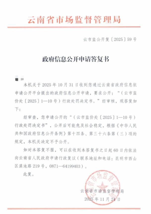 11月24日,澎湃新闻记者收到云南省市场监督管理局作出的答复书,对方以“公开后可能会危及社会稳定”为由,拒绝了此前提出的政府信息公开申请。