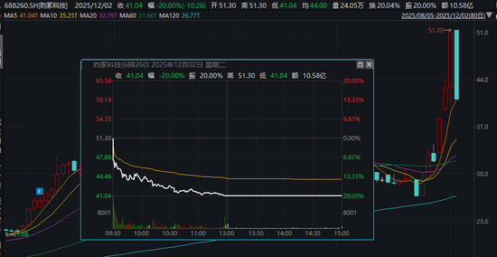 昀冢科技(688260)盘中大幅跳水,午后跌停。截至收盘,该股报41.04元/股,全日成交超10亿元。此前6个交易日,该股已累计大涨超90%。