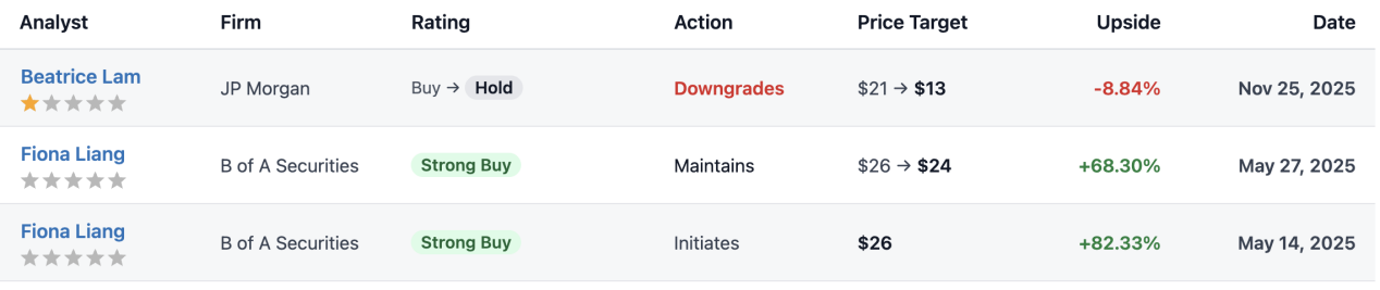 截止11月28日收盘,亿航智能股价已回升至14.26美元/股,市值回升至10.3亿美元。根据相关分析师预期,市场普遍关注其四季度交付兑现能力、资金回笼节奏及认证进展。
