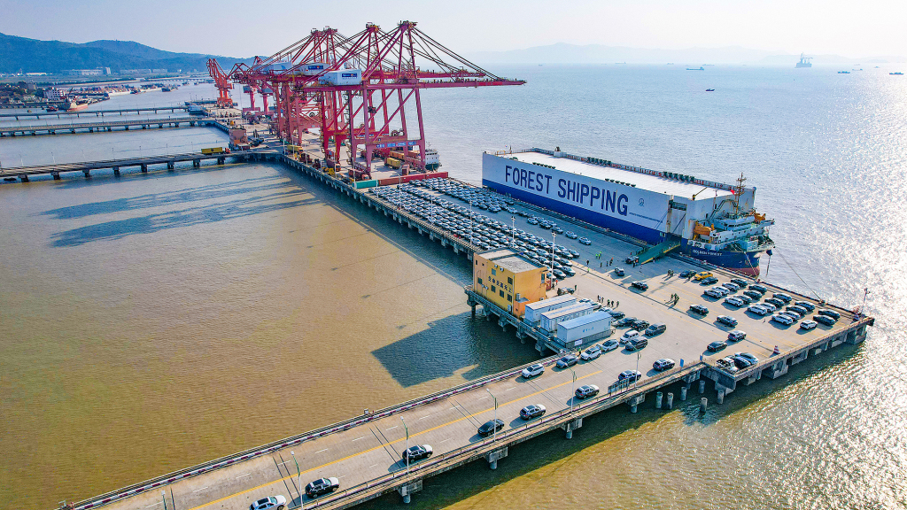 2025年11月14日,浙江台州,大麦屿港区码头,新能源车搭乘“金色森林”轮出口至俄罗斯海参崴。视觉中国 资料图
