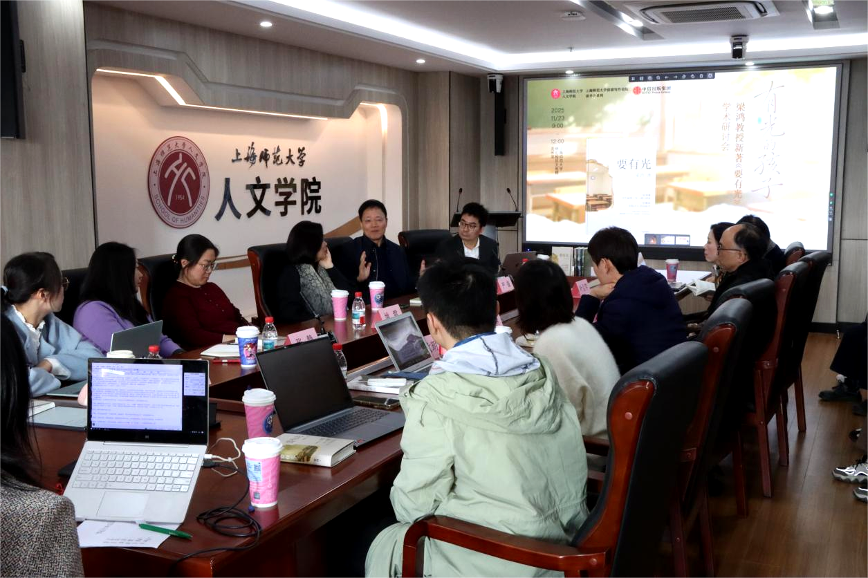 2025年11月23日上午,“有光的孩子——梁鸿教授新著《要有光》学术研讨会”在上海师范大学徐汇校区文苑楼406会议室隆重举行。中国当代非虚构写作代表人物、中国人民大学文学院教授梁鸿作主旨发言,复旦大学中文系教授严锋、复旦大学附属中山医院心理医学科副主任医师叶尘宇、上海市气象局首席气象服务官兼心理咨询师邬锐、复旦附中语文教研组组长王希明、复旦大学中华古籍保护研究院副研究员王启元、上海师范大学人文学院的姚霏老师、张静老师、朱琺老师、刘欣玥老师、姚文晗老师、本科生兰洪凯等来自社会各界的嘉宾出席研讨会并发言。会议由上海师范大学人文学院中文系主任王宏超主持。