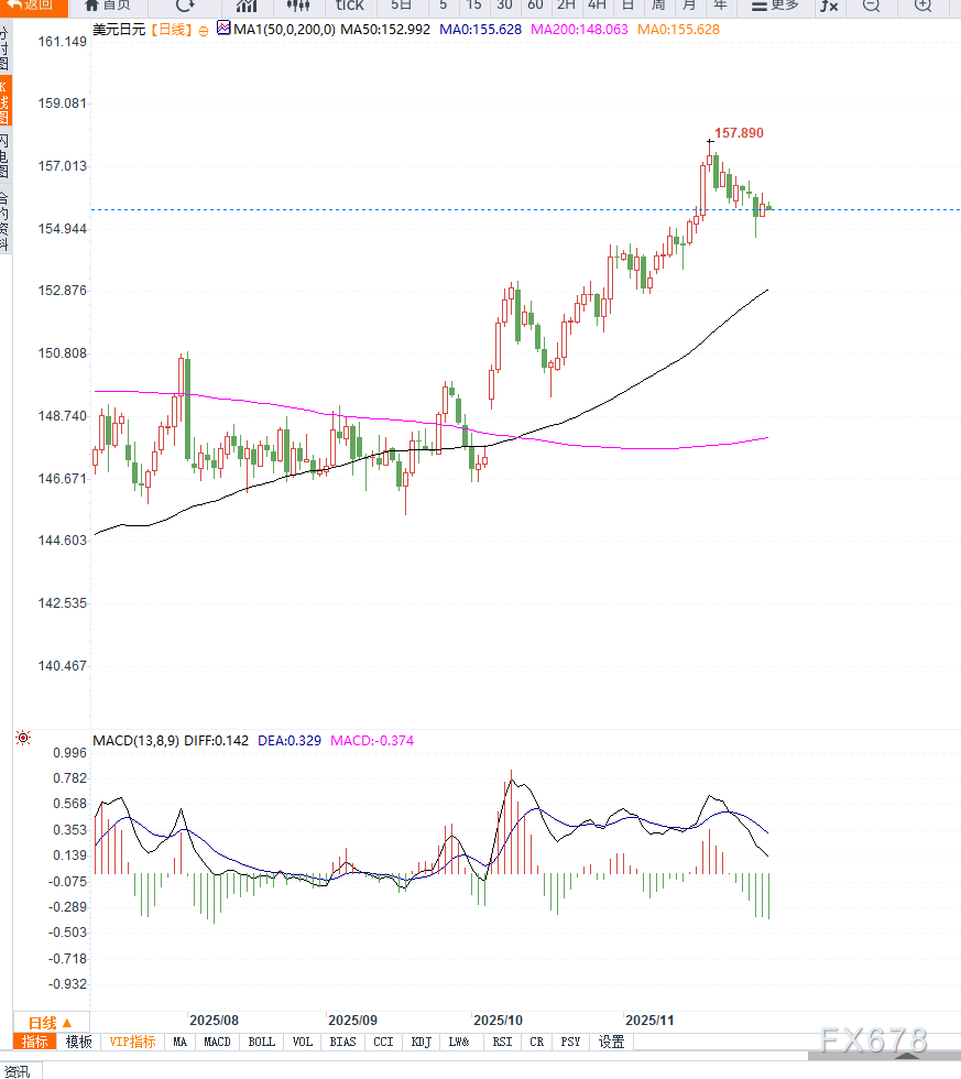 如果汇价继续维持156.00下方,则下方或将依次测试155.00与154.50关键支撑;反之,若突破短期均线并站稳,则可能出现短线修正反弹。整体技术结构仍偏向弱势整理格局。
