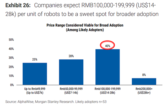 研报称,成本仍是关键门槛。92%的受访者认为,人形机器人单价需降至20万元人民币(约2.8万美元)以下才能实现大规模采用,其中40%的企业认为10-20万元区间是理想价格带。