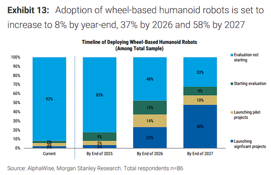 相比之下,轮式人形机器人的部署比例为2025年8%、2026年37%、2027年58%;