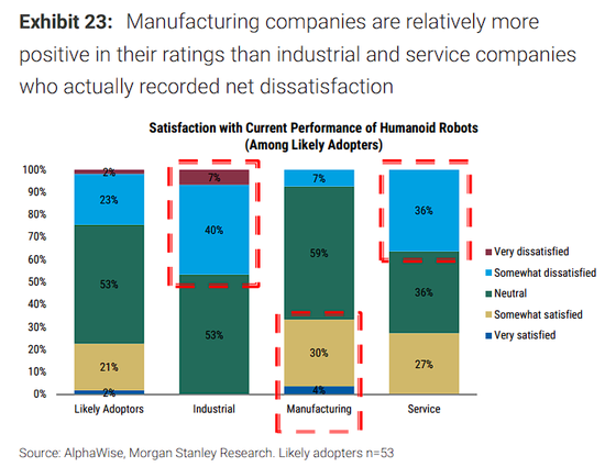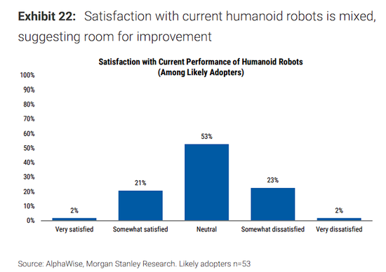 大摩调研显示,仅有23%的受访者对当前人形机器人产品表示满意,53%持中性态度,25%表示不满意。